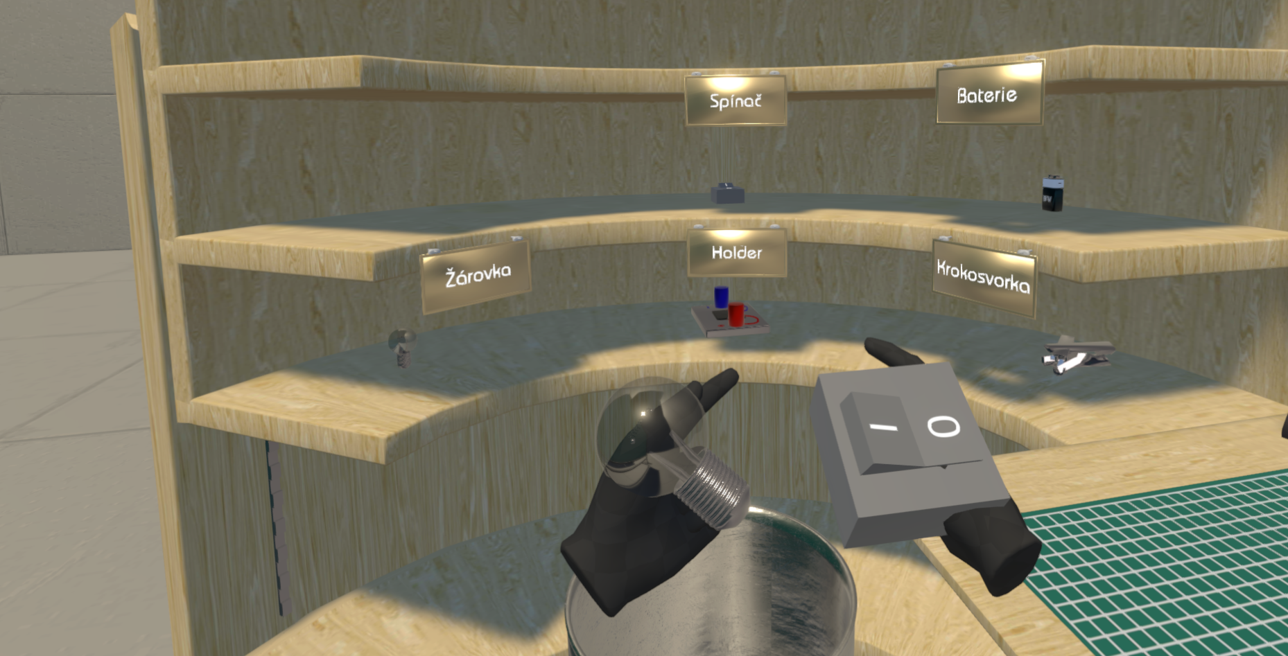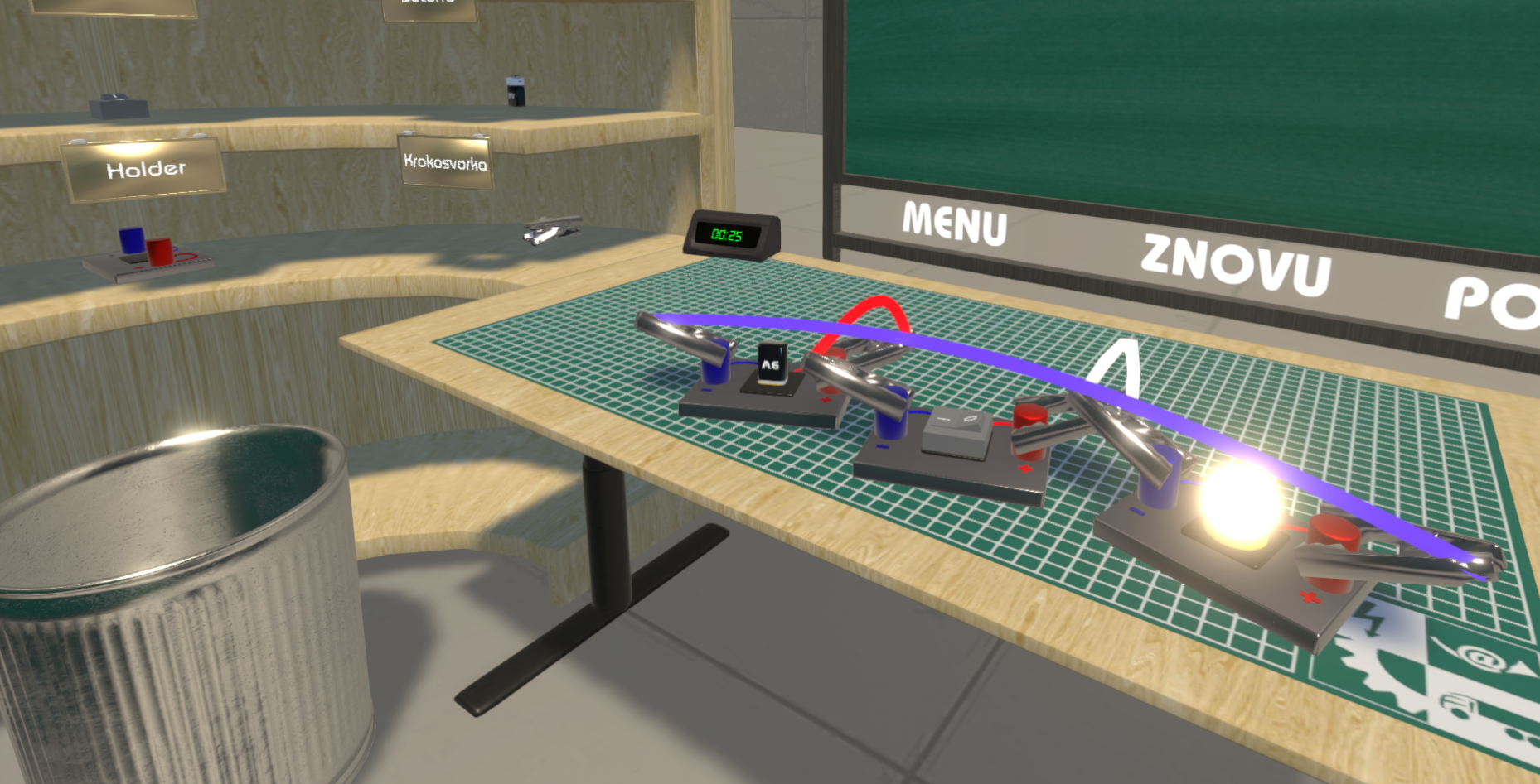 VR Modul Slaboproud žáka naučí zacházet se základními elektro součástkami, jako je baterie, žárovka, rezistor, spínač, potenciometr. Kromě samotného zapojení do sériového obvodu také zjistí, jak je to s distribucí proudu v obvodu.